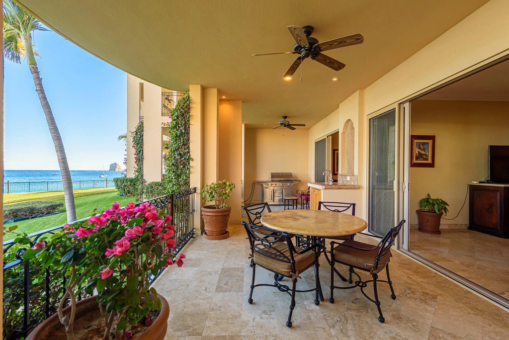 This ground floor 3BR/4BA ocean front villa has the most incredible views from the over 600 sq. ft. of terrace, with dramatic views of the Sea of Cortez. It is also just steps to the ocean, the pool, and the outdoor Jacuzzi. Including, state of the art electronics including four large TVs with satellite connection, Sony stereo system with CD and cassette player and DVD players in all bedrooms and the living room. Travertine marble flooring over 2,130.48 sq. ft. of living space with central air conditioning and ceiling fans in each room. With privilege access to tennis courts, water-slide, kids club, gym with sauna, jacuzzi, locker room, and European style spa facility, services and treatments at adjoining sister resort.