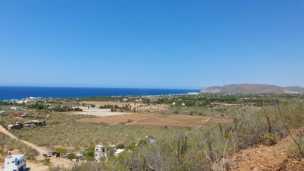 This beautiful lot has a 180-degree panoramic view from every part of the lot, encompassing some of Los Cerritos including the beach to the south and the entirety of the green farmland of El Pescadero with the Pacific Ocean beyond. It sits on a west facing slope of the ridge with good access and buildability. It is close to CFE power, but you will need to truck in the water. This location is centrally located between the attractions of Los Cerritos, and the activities and services of El Pescadero and Todos Santos. It is just over a kilometer to the beach, and it makes a pleasant walk. There are many other walks among the hills or to the surf beach at Cerritos.