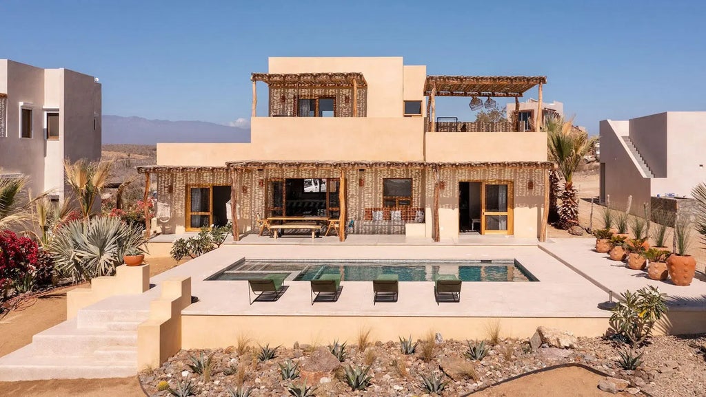 Welcome to Casa del Arco. This environmentally sensitive and luxurious 3 bed/3.5 bath home was built in 2021 by a renowned local design/build team with attention to craft and usability. Featuring warm parota wood and pulido finishes, the house feels both modern and inviting. It's nestled in the desert between the mountains and ocean. Each bedroom has its own en-suite bathroom. The two primary bedrooms feature King size beds, while the third bedroom has a queen bed and two lofted single beds, perfect for families and visitors. The saltwater pool is heated and a hot tub is great for star-gazing. The entire home has a water filtration system and Generac backup generator. This beautiful home comes furnished with stunning pieces and has a highly-profitable proven track record as a rental.