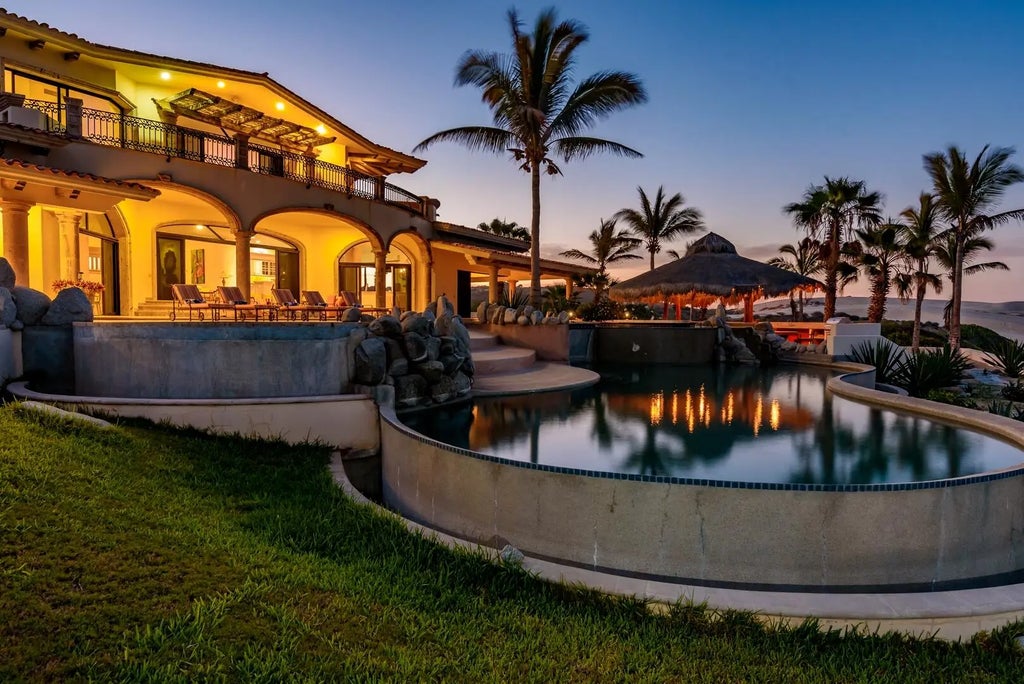 The main villa features five bedrooms and six bathrooms, thoughtfully arranged around an expansive outdoor patio designed for relaxed coastal living. Dual swimming pools, connected by a waterfall, flow toward a ten-person spa, while expansive pocket doors dissolve the boundary between interior and exterior spaces. A palapa-shaded dining area comfortably seats twelve, ideal for entertaining against a backdrop of sea and sky.