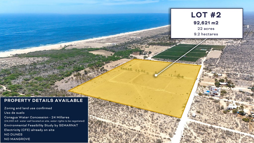 Development Lot, Plush Conditions for Farm and gardening, Prime Luxury Farm to table opportunity! Development Lot - 9.2 Hectares with Infrastructure in Todos Santos. With a total area of 92,621 m² (22 acres / 9.2 hectares), this lot presents an exceptional opportunity for developers and investors seeking to establish themselves in one of the fastest-growing regions of Baja California Sur. This is a rare and unique opportunity — one of the few oceanfront parcels available with NO DUNES and NO MANGROVES, ensuring maximum buildable potential. The gentle slope of the land offers stunning view opportunities, making it ideal for development or even farming. The property is equipped with key infrastructure and documentation: - Zoning and land use confirmed - CONAGUA water concession for 24,000 m³ (water well located on site, water rights to be negotiated) - Environmental Feasibility Study by SEMARNAT - Electricity (CFE) already on-site - No dunes or mangroves Additionally, the 5.3-hectare oceanfront parcel connected to and directly in front of this parcel is also available for sale and the seller is willing to deal on both and offer attractive financing terms. MLS #25-2660 Ideally positioned: - SJD International Airport - 90 mins - Cabo International Airport - 65 mins - La Paz International Airport - 80 mins - Green Room - 7 mins - Todos Santos Downtown - 15 mins - Cerritos Beach - 30 mins Whether you're seeking long-term investment security or ready to develop in one of Baja California Sur's most sought-after coastal regions, this property delivers outstanding potential in a peaceful yet strategic location.