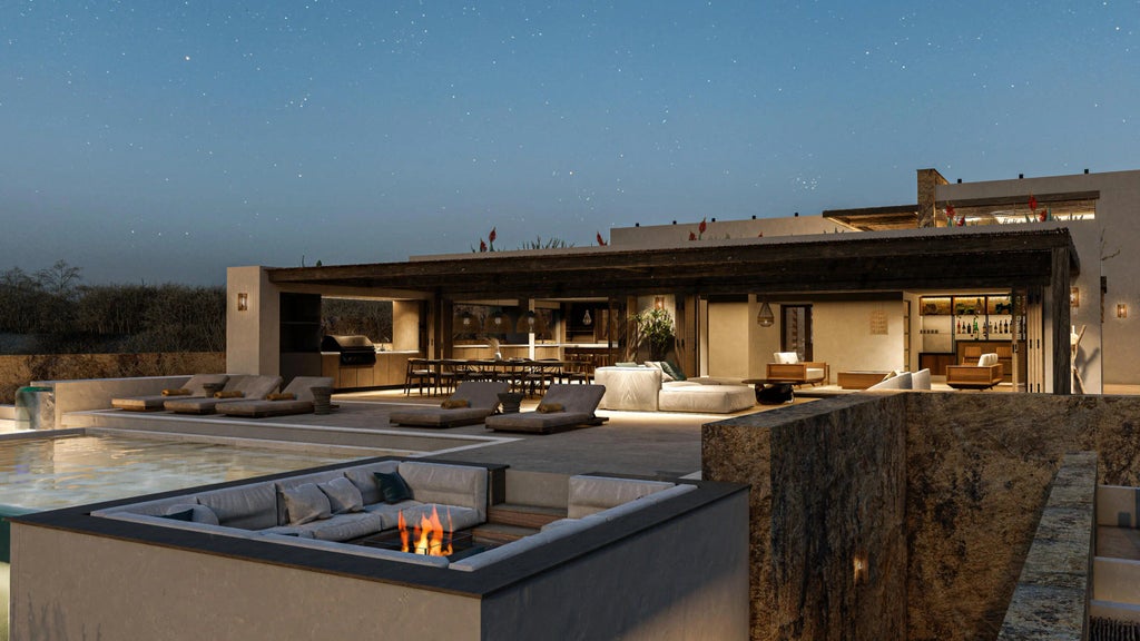 The proposed villa features five spacious bedrooms, open-concept living and dining areas, and expansive terraces. Outdoor amenities include an infinity-edge pool overlooking the ocean, a sunken fire pit lounge, multiple lounging areas, and landscaped courtyards that create a seamless flow between the desert environment and the home's modern architecture. A rooftop deck offers panoramic views, while the layout has been carefully crafted to provide both privacy and entertainment spaces.