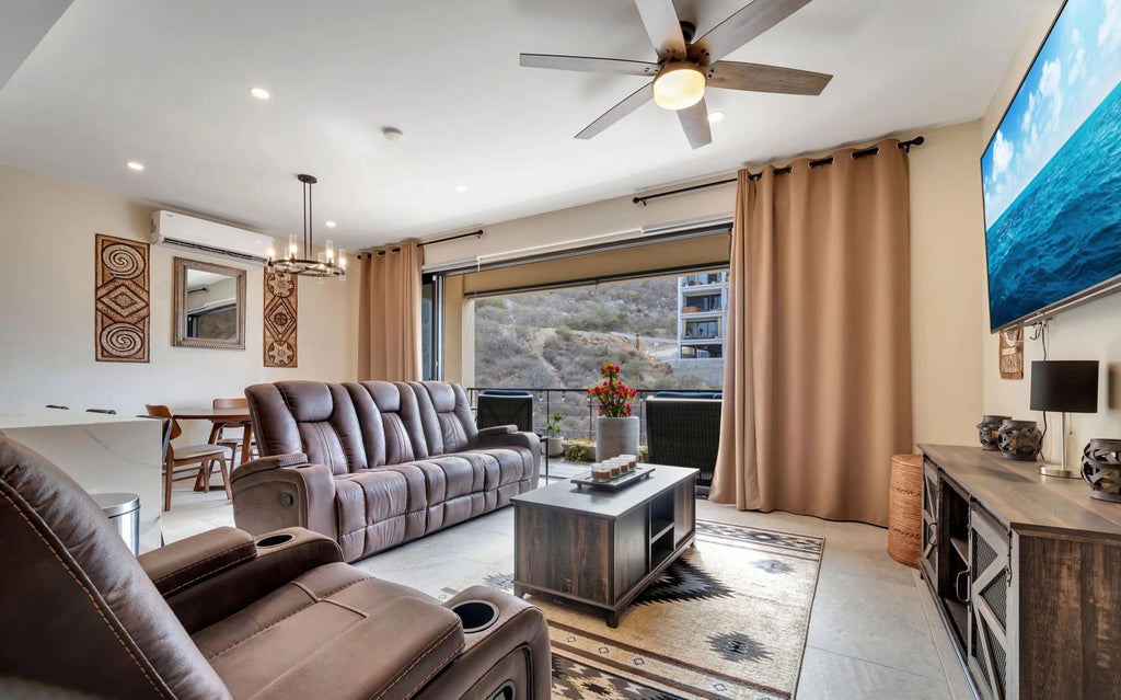 A very well appointed 3 bedroom/2 bathroom condo in Sunset Hills. Beautiful updated kitchen that flows right into a nice entertaining space that leads to an outdoor terrace (windows are tinted and screened for privacy) for a true indoor-outdoor feel. Spacious bedrooms with enclosed closets and bathrooms with ample amounts of space. Amazing lighting throughout the condo with great views of the pool area and the mountains. Added outdoor blinds for extra privacy within the unit. Two secured and covered side by side enclosed parking spots. Community features an extremely large gym with brand new equipment, a large pool and fireplace for gatherings and an outdoor space that could be used for parties/entertaining and an elevator. Located within 5 minutes of downtown Cabo/marina. Priced competitively to sell! Don't miss out on this opportunity.